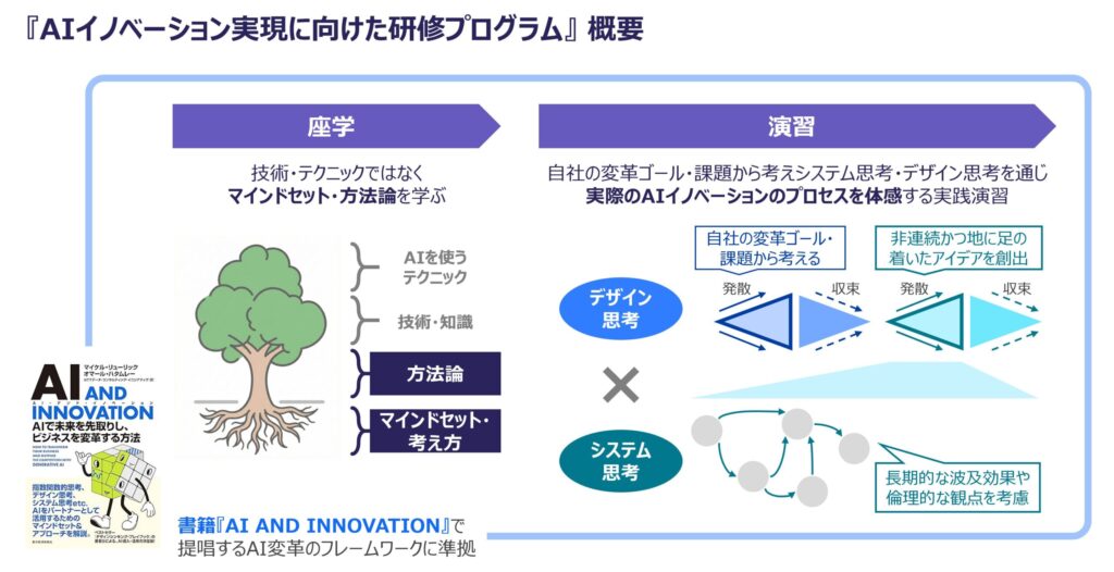 本研修プログラムは、書籍『AI AND INNOVATION』で提唱するAI変革の体系的なフレームワークに基づいています。AIツールの使い方など単なる知識の習得ではなく、座学と実践演習を通じ、AIを活用したイノベーションを生み出すために必要なマインドセット・考え方、それに基づくAI変革の方法論を身に付けるための実践的な研修プログラムとなっています。