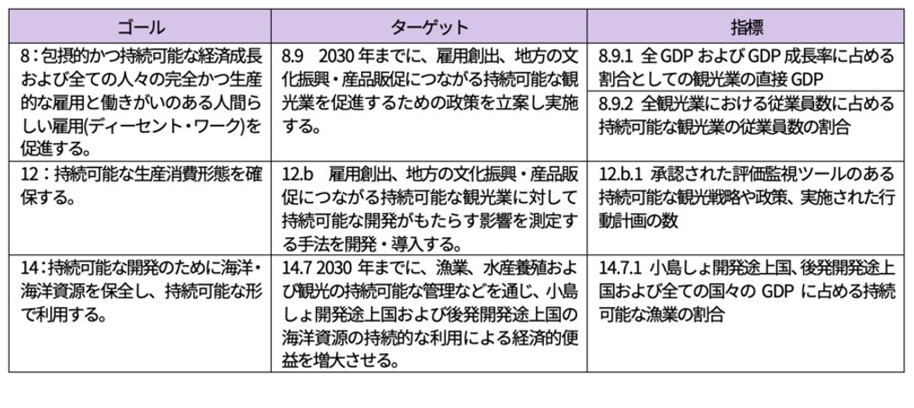 UNWTOや国連開発計画(UNDP)では、観光振興をSDGs達成に向けての重要な要素と位置付けており、SDGsが掲げる17ゴールのうち、ゴール8、12、14の中の各ターゲットにおいて「観光(Tourism)」が直接言及されている(表1)。
