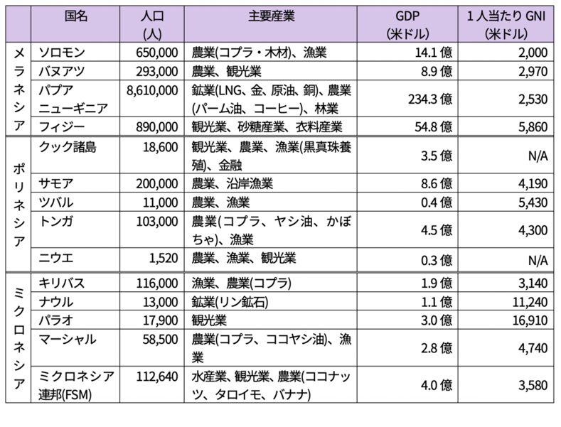 14カ国すべてを合わせても人口は約1,100万人、国土面積合計も約530,000㎢(日本の約1.4倍)と非常に小さい。一方で、排他的経済水域(EEZ)は19,780,000㎢(日本の約4.4倍)で、その豊富な海洋資源は注目に値する。パプアニューギニアのように潤沢な地下資源に恵まれている国もあれば、パラオやFSMのように旧宗主国からの財政的支援に依存している傾向のある国、キリバスやツバルのように大きな財政的支援がなく自立そのものが困難であると目される国など状況はさまざまであるが、地域全体としては以下のような開発課題を抱えている。
