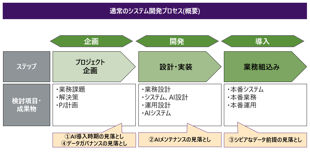 AIの特徴を踏まえずに業務に導入してしまうことにより、企業は投資を無駄にするだけではなく、コーポレートガバナンスまで毀損する可能性がある。また、このような失敗は企業全体のAI導入意欲を後退させ、全社的なAIやデジタル技術活用の機運をくじくことにつながる。だからこそ、AI導入を成功に導くためのプロセスやポイントを事前におさえ、適切に企画から導入までのステップを進めていくことが重要となる。