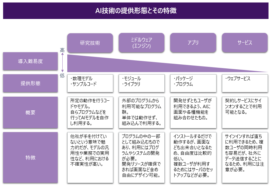 AI技術自体がいまだ成長・発展しているものということもあり、その提供形態についてもいまださまざまな形態が模索されている。同じ用途のAIであっても、アプリケーションとして作りこみが完了しているものから、ただのソフトウェアモジュール、あるいは研究レベルのAIモデルまで、多様な形態のAI技術が同時並行的に発展している。