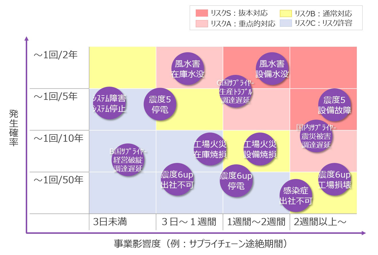 可視化したそれぞれのサプライチェーンを前提に、その途絶を引き起こす可能性のあるリスクを抽出・評価する。一般にリスク評価は、リスクの“発生確率”とその“事業影響”を定量化・指数化し総合評価することが多いが、リスク発生確率にせよ事業影響にせよ、その定量化は精緻なモデルを用いたとしても限界がある。そこで簡易的な評価ツールとして「リスクマトリクス」がよく使用される(図3)。