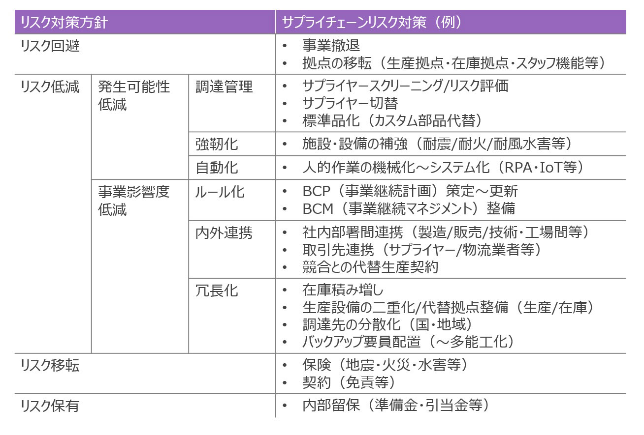 リスクの性質とリスク評価の結果を勘案し、サプライチェーンの途絶を回避・軽減するための対策(打ち手)を決定する。この際、サプライチェーン途絶から復旧までの期間(目標復旧時間:RTO)を設定し、このRTO実現のための各種対策を単一~重層的に実施する(表2)。