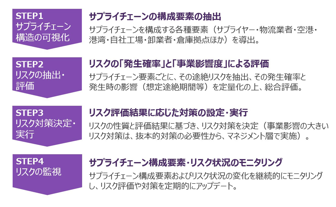 以下に、サプライチェーンに関わるリスク管理の枠組み「サプライチェーンリスクマネジメント(SCRM)」の基本的な実施ステップを示す。一般にその構造は、「サプライチェーン構造の可視化」「リスクの抽出・評価」「リスク対策決定・実行」「リスクの監視」の4ステップで説明される(図1)。