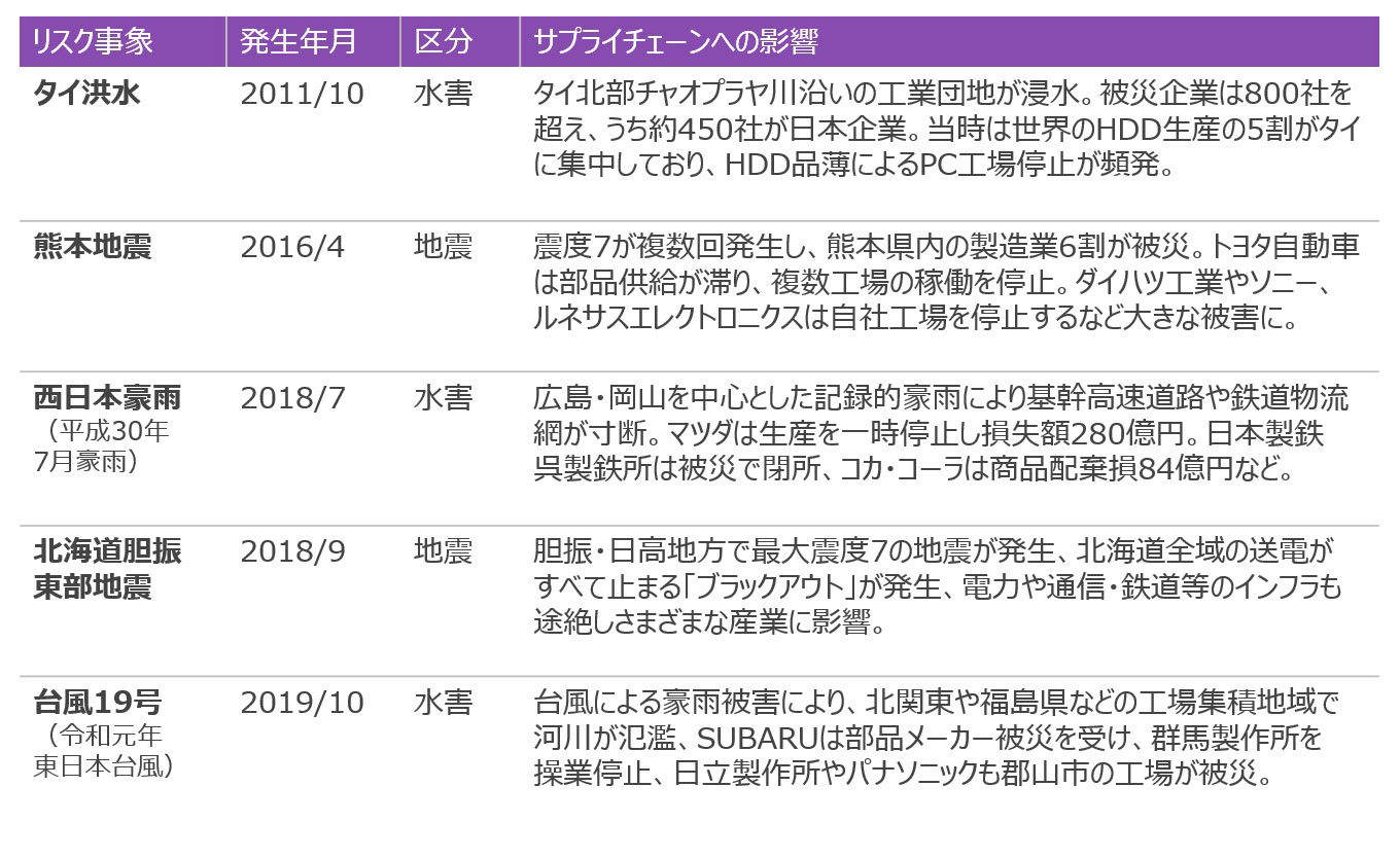 しかし、サプライチェーンを途絶させる原因事象は、今回のような感染症だけではない。サプライチェーンの脆弱性が浮き彫りになった東日本大震災を例に取るまでもなく、過去数年間を遡るだけで、さまざまなタイプの災害が企業のサプライチェーンを広範囲・長期間に途絶させ、大きな供給トラブルを引き起こしてきた(表1)。各企業はこうした突発的なリスクによる供給トラブルを組織的な対応で回避すべく、10年ほど前から、「BCM(事業継続マネジメント)」の方法論を踏まえた各種リスク対応に取り組んできた。しかし、サプライチェーンの途絶に対して、未だ多くの企業が途絶リスク発生後の「事後的・場当たり的」対応に留まっている印象が強い。