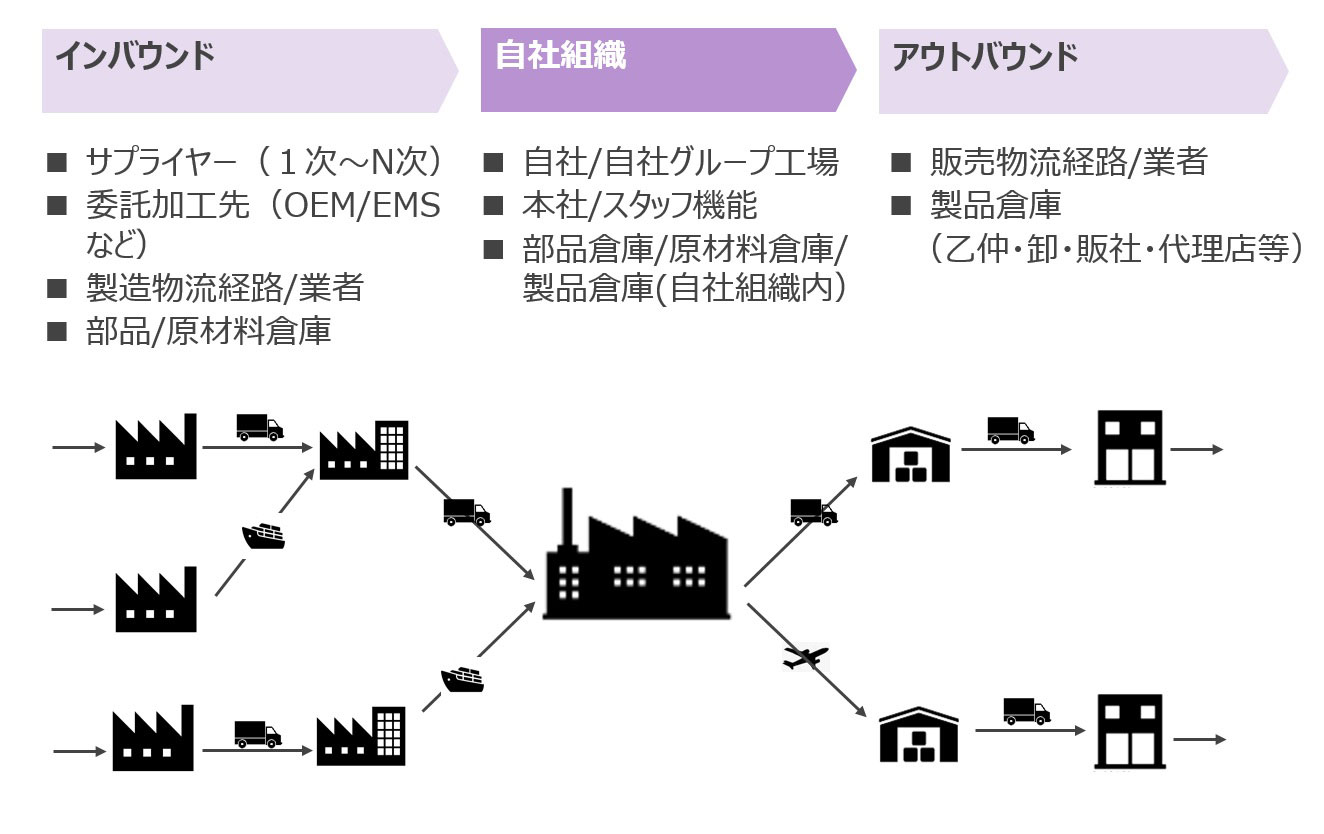 最初の段階で、自社ないし自社事業のサプライチェーンの構成要素とそのつながりを抽出・整理する。ここでのサプライチェーンの単位は、事業単位(または大きな製品グループ単位)とする。この際、自社または自社グループ領域の要素だけでなく、「インバウンド領域(部品や材料を自社に供給するサプライヤーや委託加工先、調達物流に関わる要素)」と、「アウトバウンド領域(製品を顧客に供給するまでの倉庫や販売物流に関わる要素)」の3領域を押さえることが必要になる(図2)。なお、自社と取引のある一次サプライヤーが原因となる供給トラブルだけでなく、二次サプライヤー以降のサプライヤーの供給途絶が原因になる場合が多いため、一次サプライヤーの先にいる二次サプライヤーや三次サプライヤーについても調査する。この調査は一次サプライヤーの協力が必須である上、二次以降のサプライヤーが中小~零細企業である場合も多く、リスク評価に必要な情報がうまく収集できない場合がある。このようなケースでは、一旦他社よりも相対的に途絶リスクが高いサプライヤーとして整理しておき、リスク対策の一環として、継続的に情報収集を実施していく。