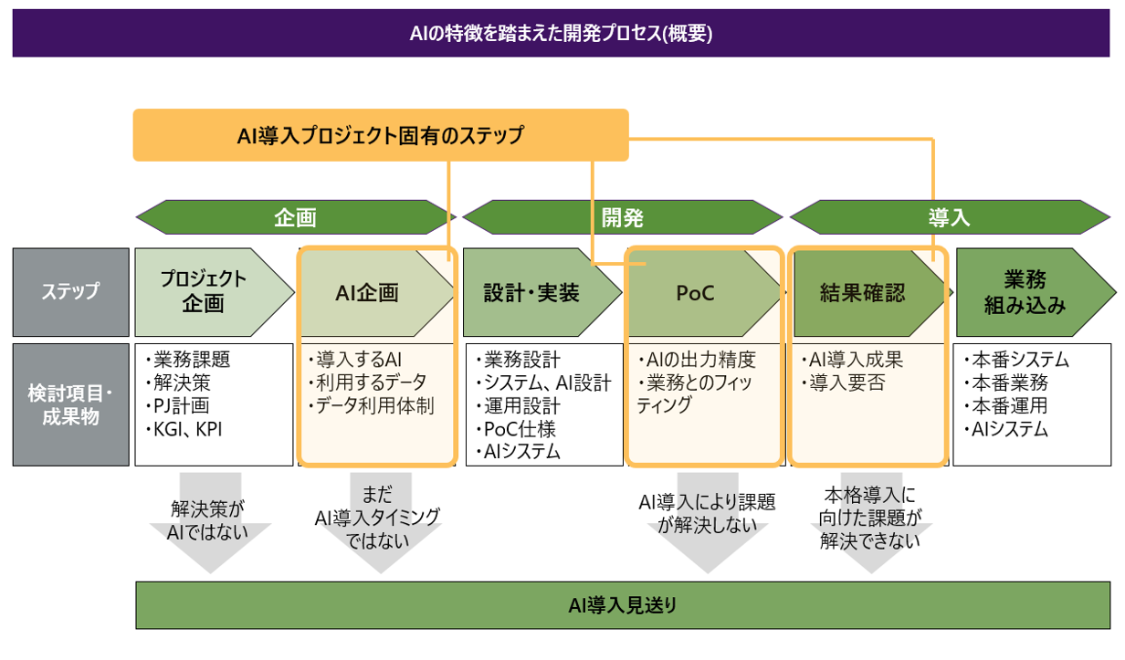 なお、場合によっては「AIの導入を見送る」という意思決定を行うことも重要だ。プロジェクトの本来的な課題に立ち返って検討や実証を行う中で、必ずしもAIが必要ではない、という結論に至ることもあるためである。そのため、AI導入においては各ステップの終了時に継続判定を行い、継続条件を満たさない場合はプロジェクトを終了できるようにすることが望ましい。このような判定を行うことにより、必要がないAI、効果がないAI、業務上動かすことが難しいAIを導入してしまう、また、その導入時期を見誤るといったリスクを避けることができる。