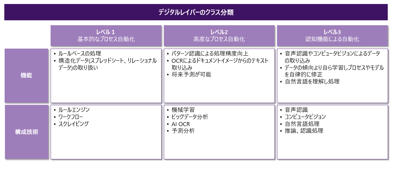 これらのレベリングを用いて現在発表されている技術や商品の分類を行い、AIが高度化していくスピードや各レベルへの到達時期などを整理し、自社の課題と照らし合わせるだけでも、導入タイミング検討の目安になるだろう。
