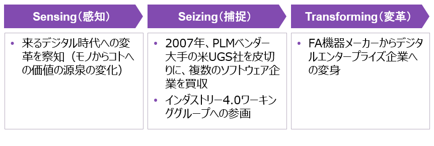 例えば独シーメンスは、2000年代には既にスマート工場実現に向けてソフトウェア企業になることを宣言した。2007年から多額の資金を投じて多くのソフトウェア企業を買収し、ドイツ政府や企業からなるインダストリー4.0[10]グループに参画し、目的達成に向け「仲間づくり」を行うことで、製造業の変革を実行している。世界市場で同社と覇権を争う米ゼネラル・エレクトリック(以下GE)も同様にソフトウェア企業へと変革し、製造業のサービス化による新たなビジネスモデルを打ち出している。デジタルへの変革は製造業だけでなく、例えば農業でも、米モンサント(2018年6月、バイエルによる買収・吸収が完了し、モンサントの企業名は消滅)、デュポン・ド・ヌムールが精密農業を推進する戦略で、デジタルの覇権争いを始めていた。モビリティ、医療、住宅分野などでも同様である。筆者がDC論を学んだ際に、欧米企業は激しい国際市場で勝ち続けるためにこの能力を発揮し、自社資源のみに頼らない組織力で戦う戦略なのだと腑に落ちた。