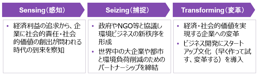 次に、「企業の競争戦略」という視点でSDGsを考えてみたい。前述の通り、欧米先進企業は競争優位を得る一つの戦略としてSDGsに即した事業開発を行ってきた。近年競争優位を構築できる企業の傾向を示す「ダイナミック・ケイパビリティ(DC)論」が注目されている。米経営学者デイヴィッド・ティースによって提唱され、急速な環境変化に対応し、社内外の資源・能力を統合、構築、再構成しながら持続的な競争優位を作り上げる企業の能力を指す[9]。同理論は、企業の競争優位は企業固有の資源で決まるという理論に反し、社内外の資源を有効活用できる組織能力こそが重要だと主張する。この能力は、以下三つの活動で構成される。