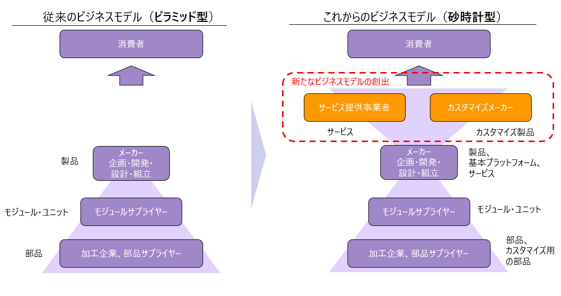 顧客ニーズが多様化する中、生産や販売のボリュームを活かしつつ、個々の顧客のニーズに合わせた製品・サービスを販売するマスカスタマイゼーション(製品のカスタム化)への対応や、製品(ハード)にサービス(ソフトウェア)を付加した新たな体験価値を提供するビジネスモデルが誕生している。