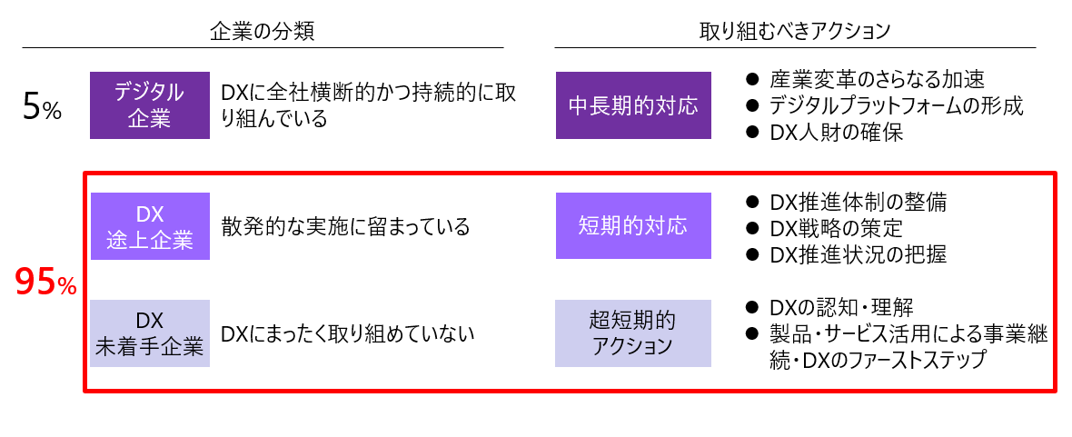 経済産業省が2020年12月に発表した「DXレポート2」[2]によると、DXに全社横断的かつ持続的に取り組んでいる日本企業はわずか5%だ。95%は、DXに全く取り組めていない、もしくは散発的な実施に留まっている。(図2:企業のDX取り組み状況と取り組むべきアクション)同レポートでは、デジタル競争における勝者と敗者の明暗がさらに明確になることを懸念しており、企業のDXへの取り組み状況に応じて、今後取り組むべきアクションを提言している。
