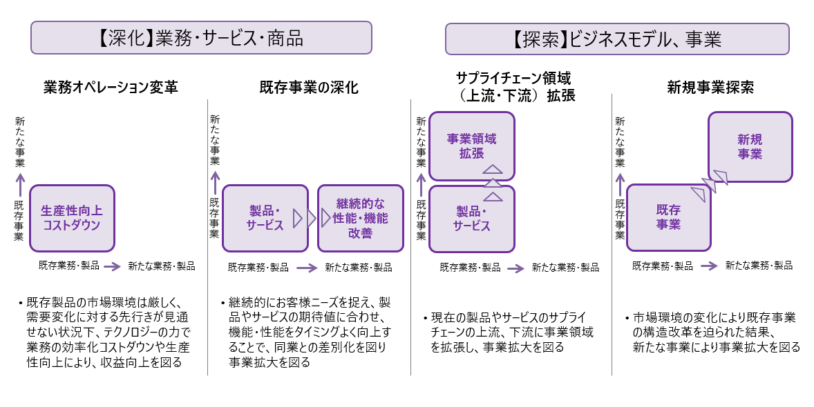 - 企業がデジタル化の取り組みに精通し、効果を創出するまでには時間がかかるため、長期的な視点に立ち、サービス・商品の「深化」とビジネスモデル・事業の「探索」を続けるアプローチが有効