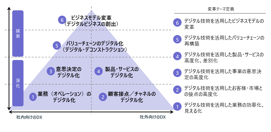 我々は、DX実践企業の取り組み事例について継続的に調査・分析を行い、デジタル化を進める上でのエッセンスを整理し、デジタルを活用したビジネス変革を以下6つのDX類型に定義した。(図4:DX実践企業からの取り組みテーマの類型化)