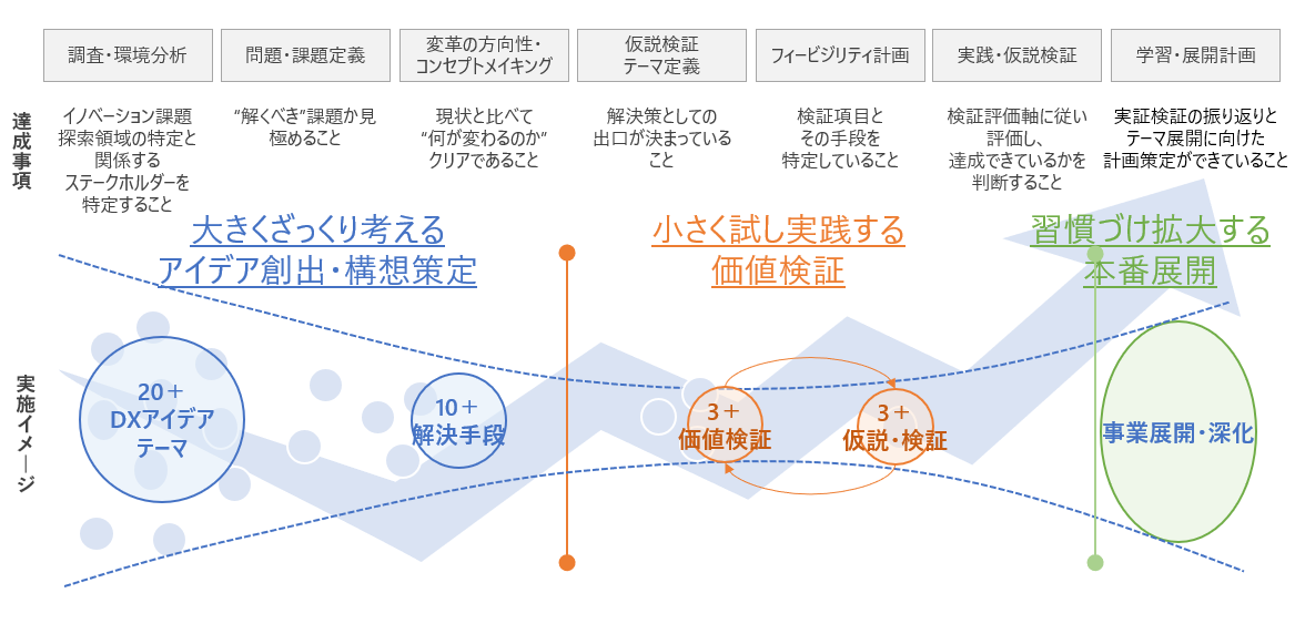 特に、検討の初期段階は、細部にこだわったDX構想に時間をかけるのではなく、“大きくざっくり考える”というイメージを持ち、とにかく推進することが重要である。たとえラフなアイデアであっても、走りながら考え、前に進めることを意識し、事業として本当に解くべき課題は何か、業務・事業を変革するための課題は何かを深めることに重心を置いたうえで、関係するステークホルダーと議論しながら見極めていくことが大切である。