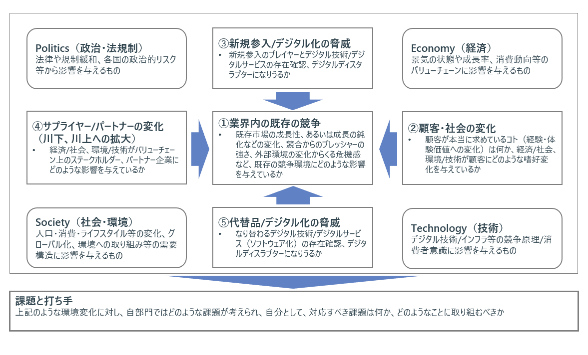 デジタル化の取り組みは、データやデジタル化によるビジネスの変革、さらには企業変革を目指すべきであり、長期展望に立って推進することになる。それには、基本的なことかもしれないが、検討の初期段階(アイデア創出・構想策定フェーズ)にて企業を取り巻く環境分析を行い、関係するステークホルダーの動向を見極めることを推奨する。