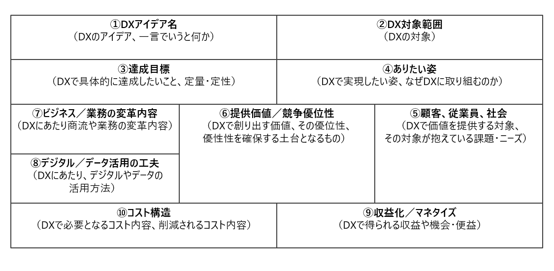 共有にあたっては、以下に記載しているDXキャンバスを活用することを推奨する。DXキャンバスとは、DXアイデアを整理し共有するためのシートで、DXテーマを推進する際に有効な検討領域を10個に整理するフレームワークだ。(図7:DXキャンバス)