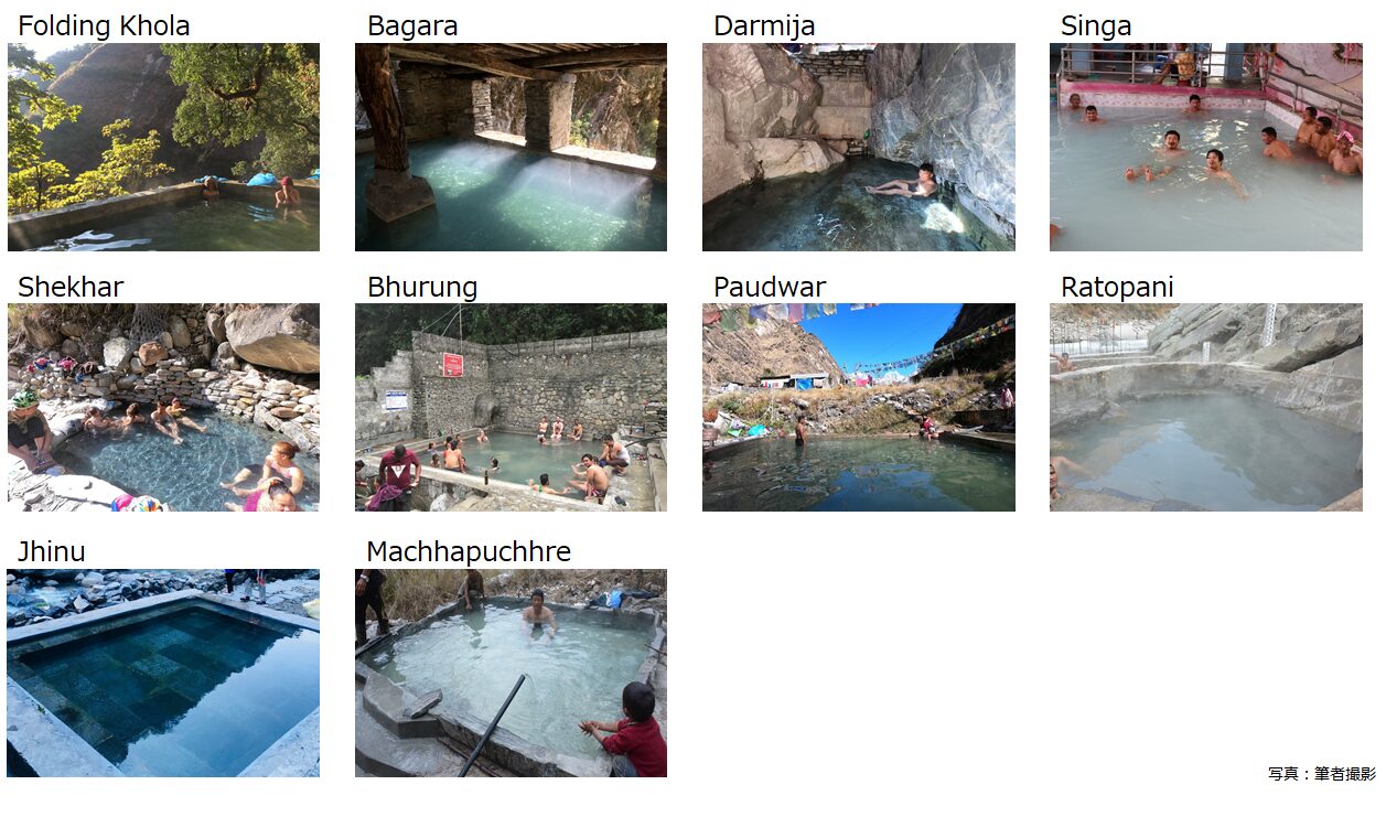 ここで、観光資源として日本人にとってだけでなく世界的にメジャーな存在である温泉を一例として、ネパールの持続可能な観光開発の在り方を考察する。まず、ネパールの温泉の現状を概観すると、前述の通り、現地では主に地元住民の湯治またはレクリエーションに利用されているほか、一部の外国人バックパッカーが立ち寄るのみであり、他の観光資源と比べてまだ一般の観光客に対して浸透しているとは言い難い。2020年2月時点で筆者が実際に現場に足を運んで確認できたガンダキ州内の10カ所の温泉の外観は図3のとおりである。なお、ネパール国内の温泉の情報について整理した文献は限られており、現地の新聞やウェブサイト、現地ヒアリング情報で断片的に取得できる情報を含めるとさらに数は存在すると思われるが、正確な数字は不明である。