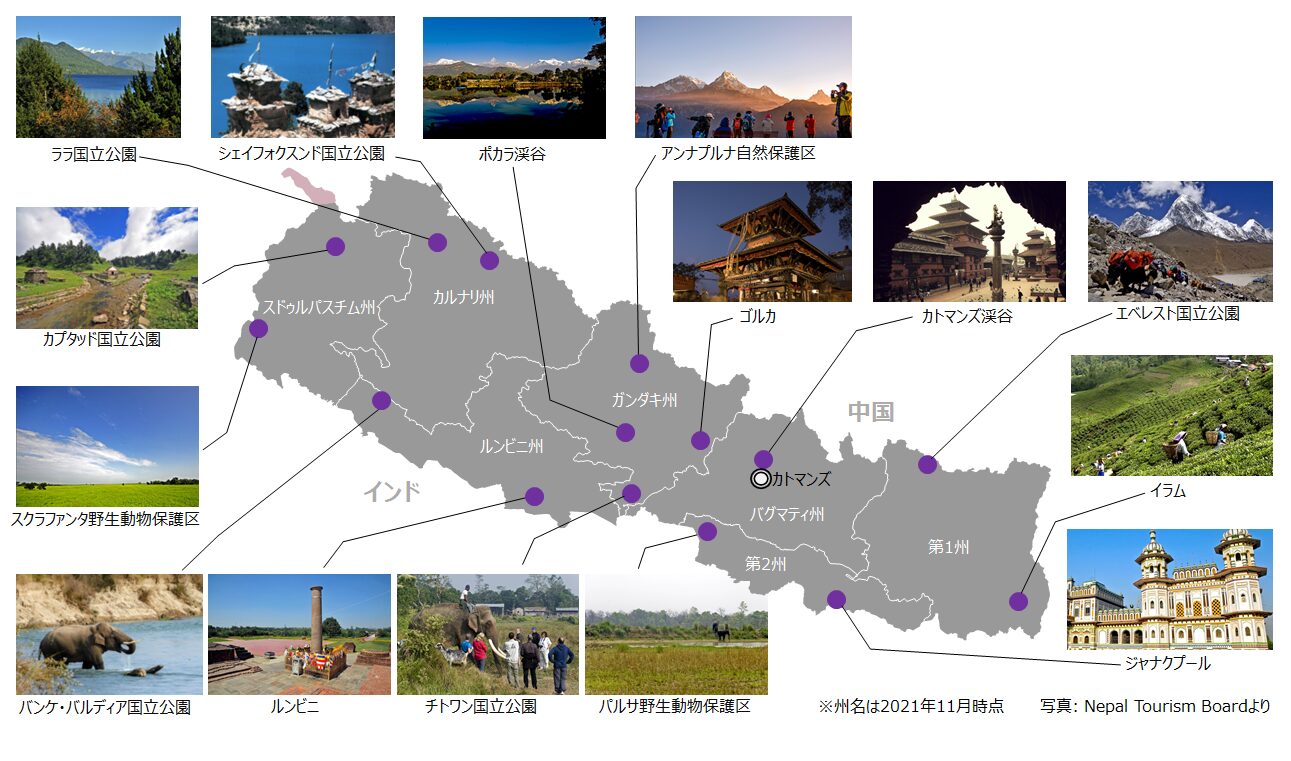 ネパール国内の観光資源は多様性に富んでおり、首都カトマンズの世界遺産群、エベレストやアンナプルナでのトレッキング、マウンテンフライト、南部チトワンなどの野生生物保護区、リゾート地ポカラ周辺での滞在・アクティビティ、聖地巡礼(ブッダ生誕地であるルンビニやヒンドゥー教寺院など)が人気である [9](下図参照)。