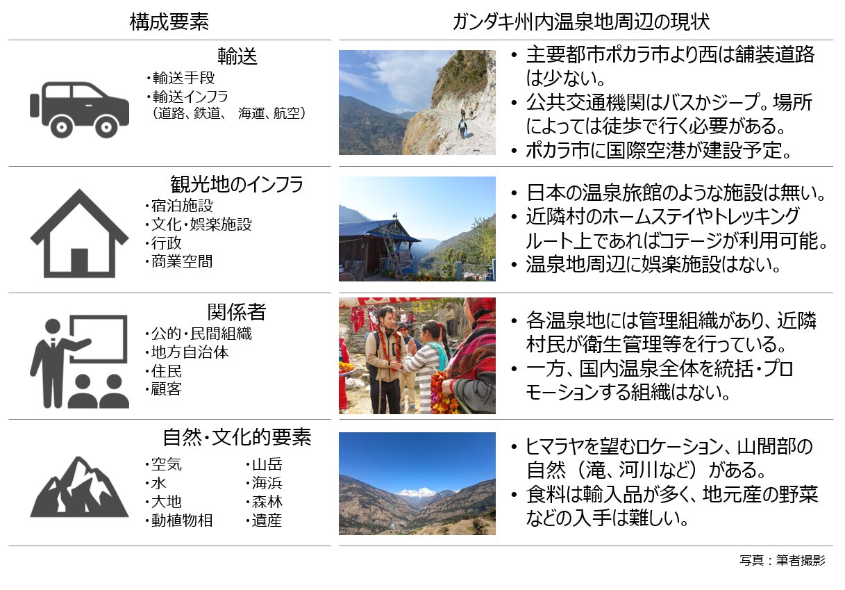 上述のネパールの温泉の現状を踏まえ、前述の持続可能な観光に必要な4つの要素である「輸送」、「観光地インフラ」、「関係者」、「自然・文化的要素」の構成要素で考察すると図4のように整理できる。ガンダキ州内はアンナプルナ保護区域に代表される自然・文化的要素が豊富であり、周辺の有名なトレッキングルート上については輸送インフラおよび観光地のインフラが整っている。一方で、トレッキングルート上から外れている温泉地周辺については、舗装路や観光客向けの宿泊地はほとんどないというのが現状である。多くの温泉地近隣の村ではホームステイを提供しており、地元民による温泉管理組織も存在しているため温泉の質自体は良いものの、日本の温泉旅館のようなイメージとはかなり異なる環境である。