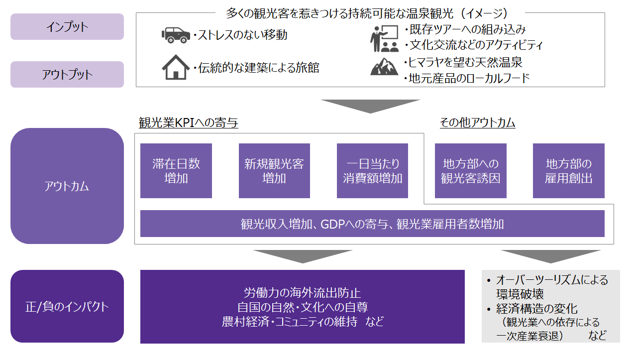こういった経済効果が創出された場合、ネパールが抱える社会課題にもインパクトが生じるだろう。例えば、地方に雇用が生まれることにより、出稼ぎを目的とした労働力の海外流出が防止できる。また、温泉観光はネパールの自然・文化的要素を含んだものであるため、外国人観光客が訪問することにより、観光を提供する側として改めて自国が有する自然や文化の価値を見直す契機にもなる。地方における雇用と自国の自然・文化への正しい価値認識があれば、農村経済・コミュニティの長期的な維持にもつながると考えられる。