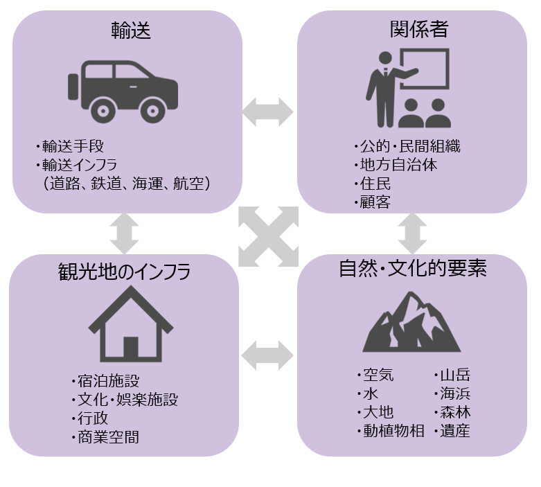 また、観光産業の持続可能性を考察するフレームワークの一つとして、観光を構成する4つの要素があり、それらは「輸送」、「観光地のインフラ」、「関係者」、「自然・文化的要素」とされる。例えば、鉄道や航空などの輸送手段やホテルといった観光地のインフラがなければならないのは当然のこととして、観光地を支える官民組織や地域住民をはじめとする関係者の協力もなくてはならない。また、近年マスツーリズムによる環境破壊などの問題もあるように、観光地周辺の自然環境・文化的遺産への配慮も重要な要素と位置づけられており、各要素それぞれが持続可能な観光を達成するために必要であるとされている(図1参照)。
