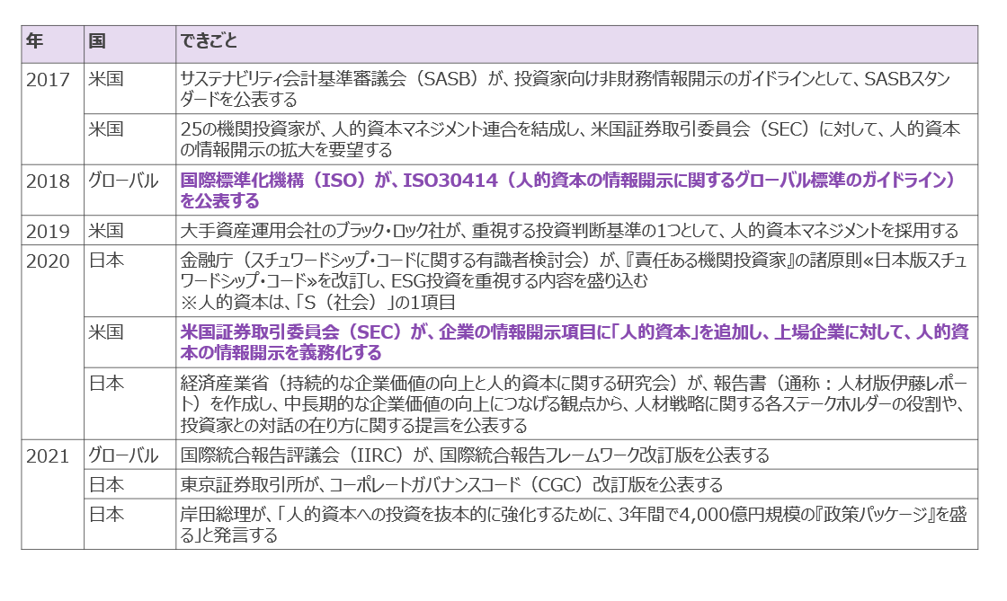 表に記載している2つのできごとが、欧米を中心に人的資本の情報開示の動きを活発化させる転機となった。