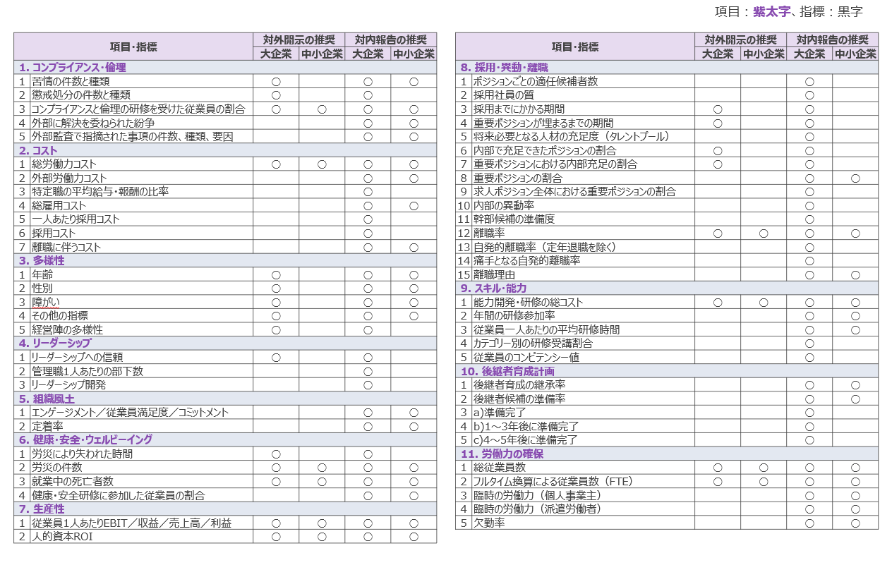 ISO30414は、遵守すべきルールではなく、あくまでもガイドラインである。開示に関して必須の項目・指標は設定されておらず、企業規模(大企業/中小企業の2分類)別に開示が望ましい項目・指標として推奨されるに留まり、開示の有無や開示内容は企業に委ねられている。