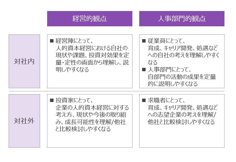まず、経営的観点では、経営陣にとっては、「人的資本経営における自社の現状や課題、投資対効果を定量・定性の両面から理解し、説明しやすくなる」、投資家にとっては、「企業の人的資本経営に対する考え方、現状や今後の取り組み、成長可能性を理解し、他社と比較検討しやすくなる」、といったメリットがある。また、人事領域に焦点を当てても、図2のように、従業員、人事部門、求職者、それぞれにメリットがある。