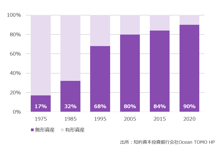 このグラフは、米国の代表的な株価指数であるS&P500に属する企業における市場価値の構成要素(無形資産/有形資産)の変遷を表すグラフ[1]である。ご覧の通り、企業価値に占める無形資産の割合は、1975年には17%にとどまり、残りの83%は機械や不動産といった有形資産が占めていた。その後、無形資産の割合と有形資産の割合が逆転し、2020年には無形資産の割合が90%を占めるまでになっている。