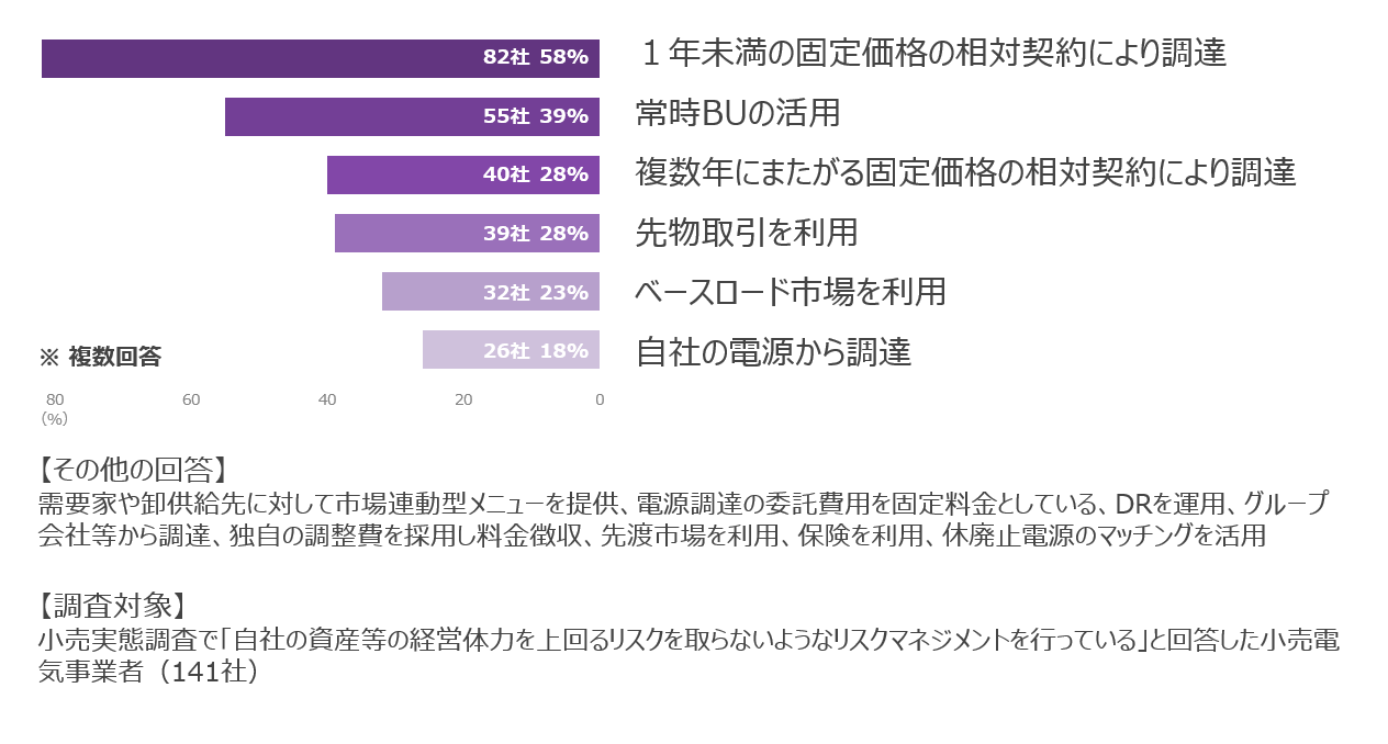 それによると、アンケートに回答した222社の小売電気事業者のうち141社が自社の経営体力に鑑みたリスクマネジメントを行っていると回答しており、その具体的な手段の内訳は下図のとおりだ(図3)。