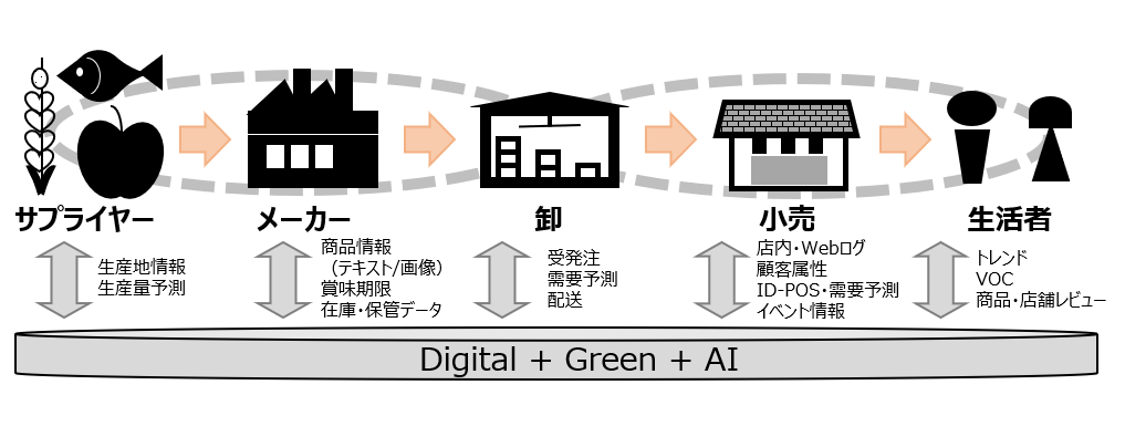 廃棄物削減と適正な供給を行うため、サプライヤー・メーカー・卸・小売など、バリューチェーン全体を横通しした情報共有の仕組みのプラットフォーム化と、AIによる需要予測を活用した生産数・発注数の最適化の取り組み。