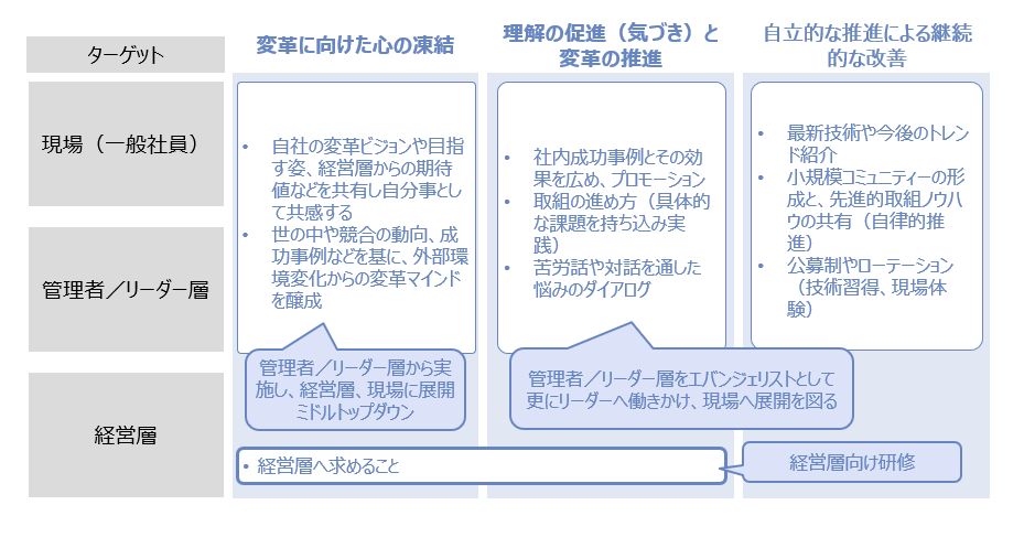 変革を阻害する様々な壁を乗り越えるには、変革へ向けた開発主体の熱量を上げ、変革に対して当事者意識高く取り組むことが不可欠である。その手段としては、自社の変革のゴールやプロセスを明らかにし、繰り返し発信、社員が自ら変革を推し進めたくなる土壌を用意し、熱量を上げるなど、様々な啓発活動(草の根活動)により実現することが考えられる。草の根活動に加えて、推進全体からの働きかけも重要となる。心理学者のレヴィン[1]は、変革に向けては、「解凍」「変革」「再凍結」という3つの段階が必要で、人の行動はその人を取り巻く環境、すなわち「場」の力によって影響を受けると述べている。変革に向けた3つの段階を「変革に向けた心の凍結」「理解の促進と変革への推進」「自立的な推進による継続的な改善」に分け、継続的な「場」を設定し、ターゲットに対して何を訴求するのかを明確にしていくというアプローチを推奨したい。