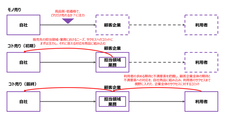モノ売りからコト売りへのシフトでは、単に提供価値を新たに生み出すだけでなく、既存のビジネスモデルの考え方を改める必要がある。その際、今までの組織構造や目標・KPIでは賄えない部分が生じてくる。そこに手を入れることに対して、抵抗を示される場合があるため、顧客の納得度合いに応じ、段階的に変化する道筋を示すことが必要になる。