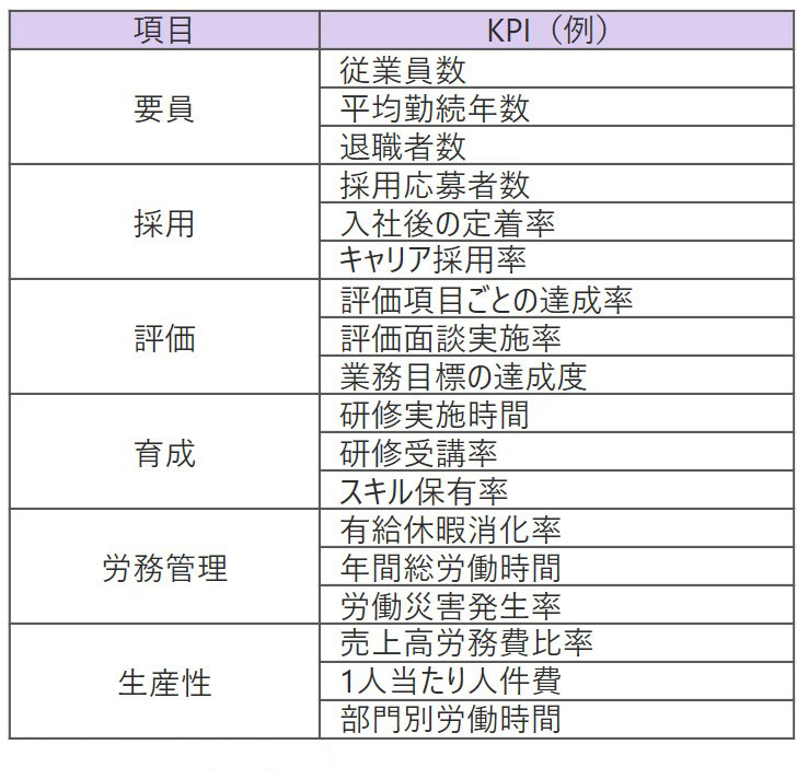 人事のKPIとは、人事部が目標達成に向けて定量的な指標を設定し、その指標を基に業務の成果を評価するための尺度のことを指す。具体的には、人事部門が担当する業務や役割に応じて、これまでも以下のような指標が設定されてきた。