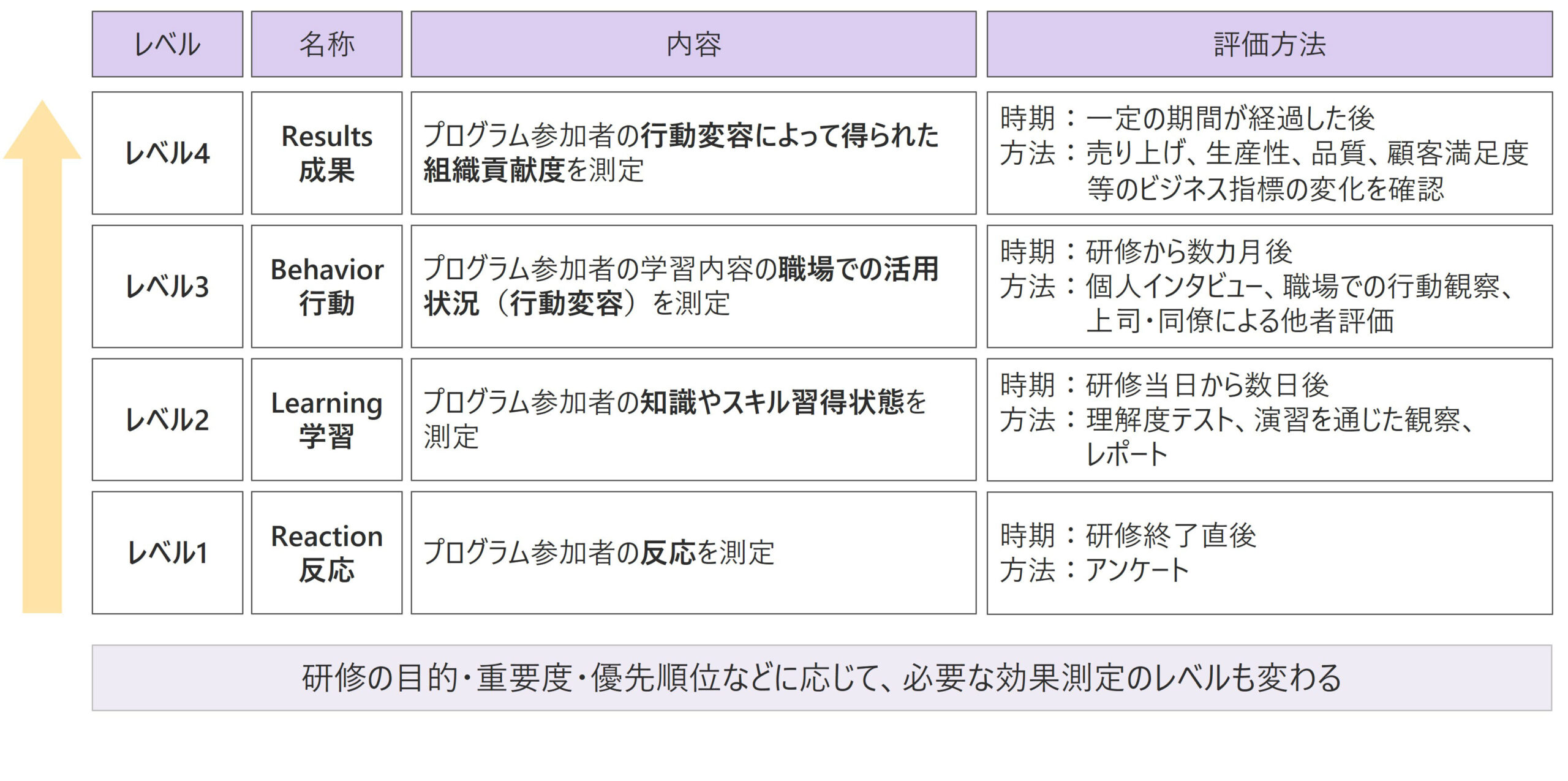 - 出典:堤 宇一・青山 征彦・久保田 亨(2007),『はじめての教育効果測定――教育研修の質を高めるために』,日科技連出版社および中原 淳・関根 雅泰・島村 公俊・林 博之(2023),『研修開発入門 「研修評価」の教科書――「数字」と「物語」で経営・現場を変える』,ダイヤモンド社を参考に当社作成
