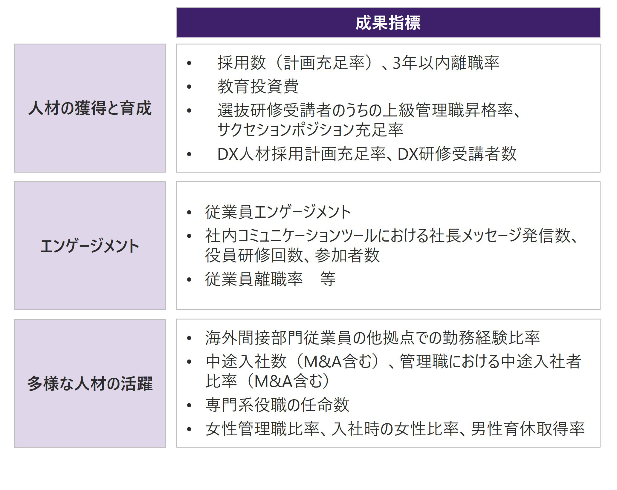 また、村田製作所では、価値創造の中核が「人材」であるとし、「人材の獲得と育成」「エンゲージメント」「多様な人材の活躍」という3つの重要課題に関するアクションと成果指標を整理している。明確な成果指標を設けることで、取るべきアクションが明確になる良い事例だろう。