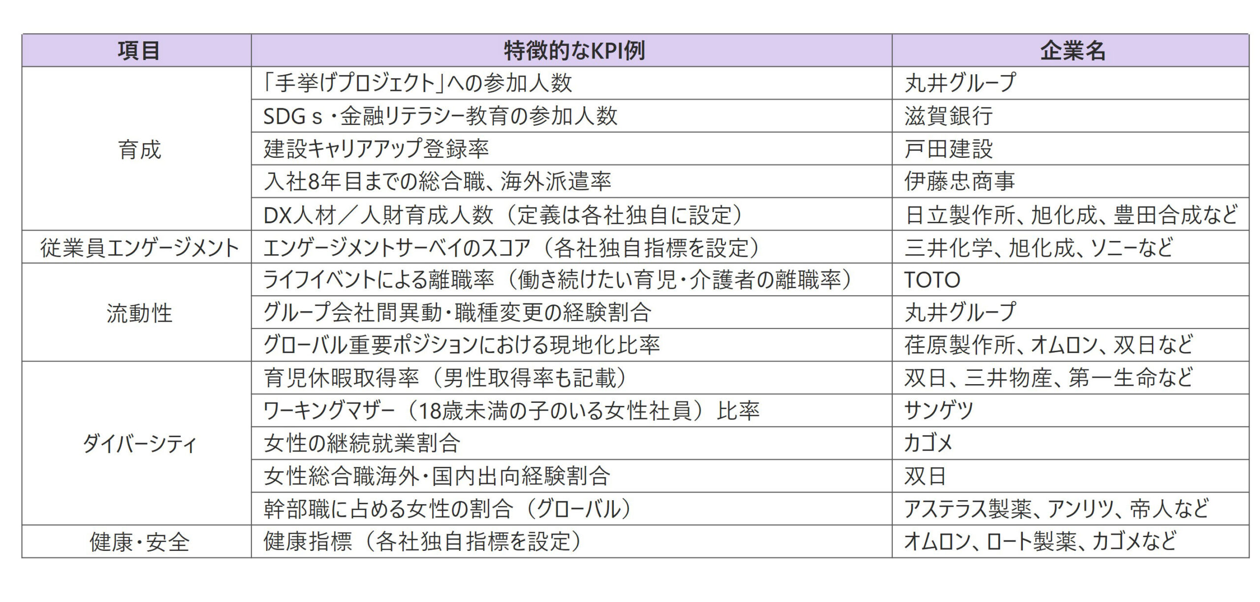 ここで実際にサステナビリティレポートや統合報告書・有価証券報告書等で公開されている企業の人事KPIを紹介する。冒頭に示した一般的なKPI例に加えて、独自性のある内容を開示している例が多い。