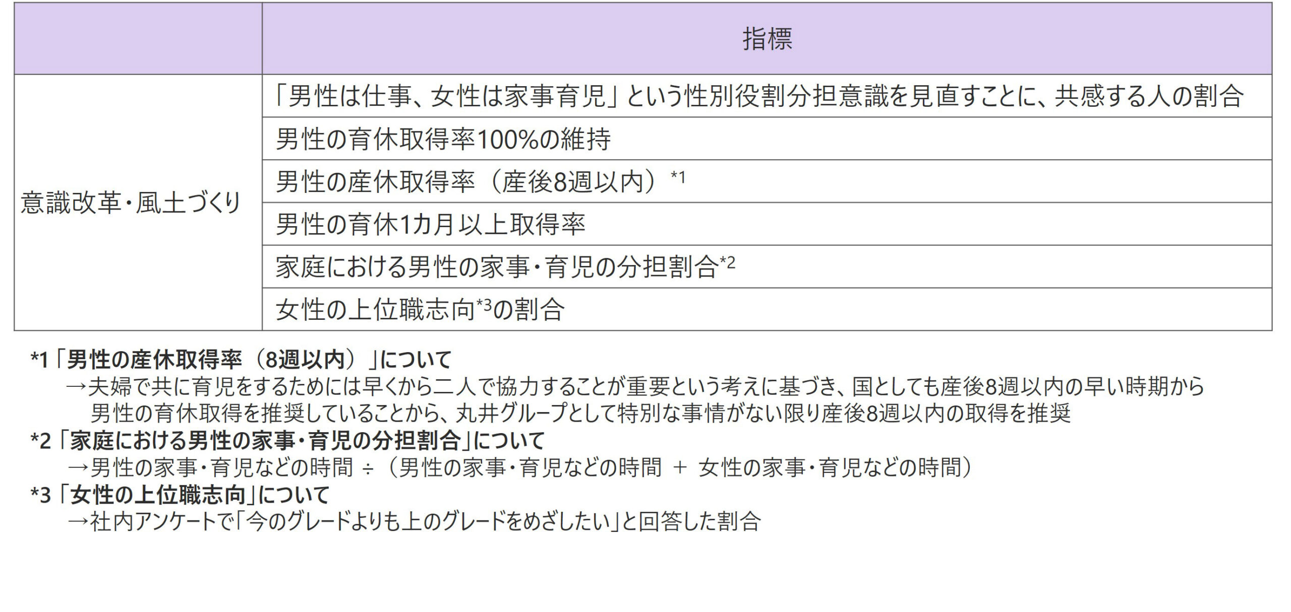 例えば、丸井グループでは、社員の約45%(2022年3月期時点)を占める女性社員の活躍を推進するため、2014年3月期より、女性活躍の重点指標として「女性イキイキ指数」を設定している。2022年3月期から26年3月期には、「性別の役割分担意識」の見直しに向けた意識改革・風土づくり面でのKPIを追加するなど、可視化によってさらなる女性の活躍を推進し、意思決定層への女性参画を増やす取り組みをしている。