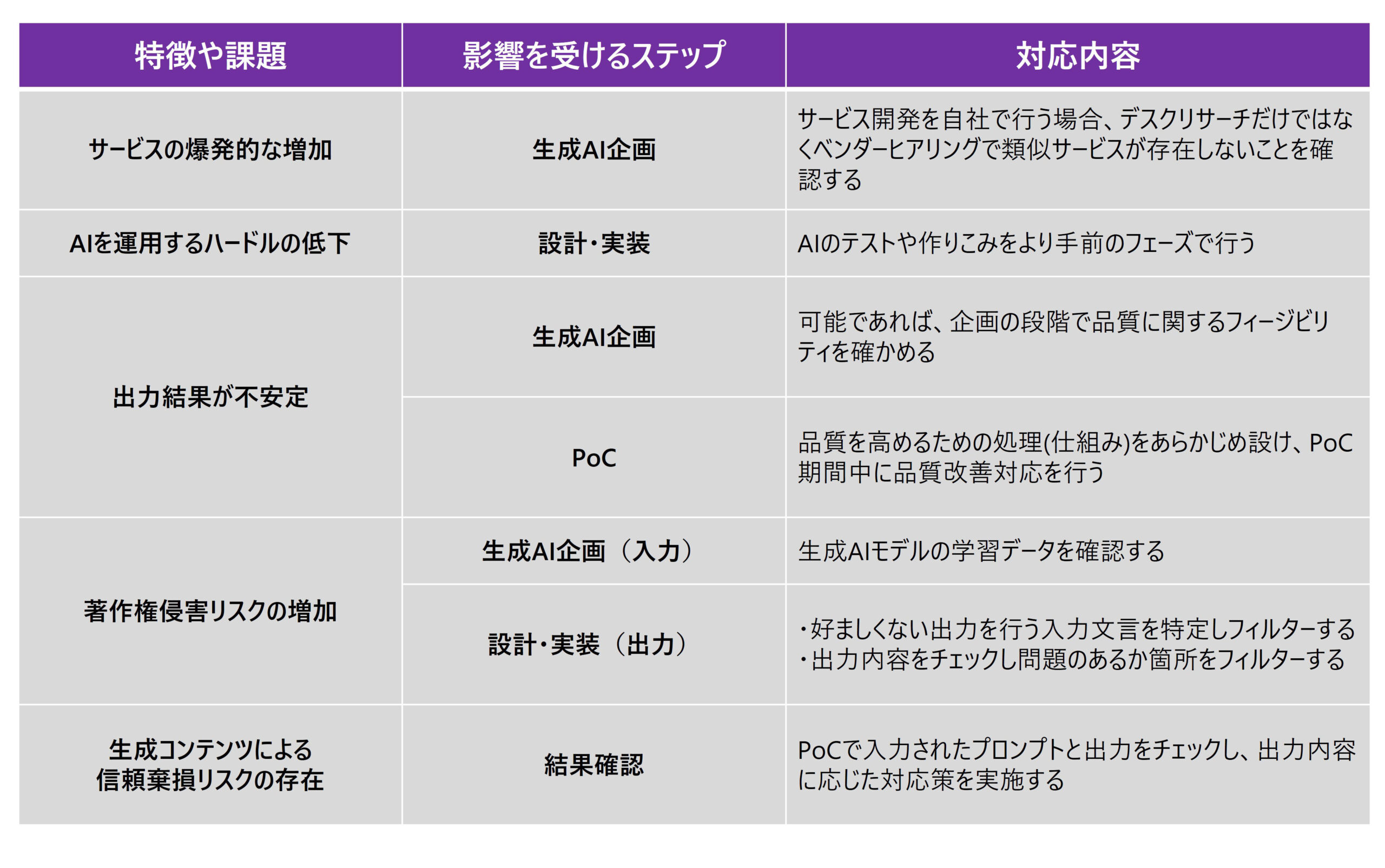 ステップの数や全体の流れは変わらないが、生成AIならではの特徴や課題を踏まえ、幾つかのステップで追加の対応が必要となっている。