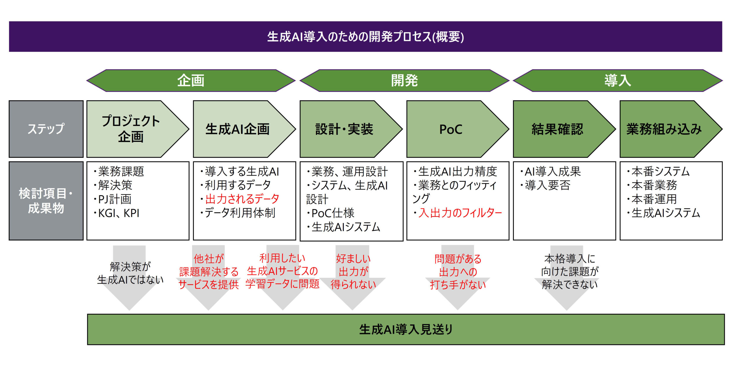 生成AIも基本的にはこのプロセスを踏襲して導入を行えば良いが、生成AIの特徴や課題に鑑みた追加検討の論点や対応すべき事項がある。生成AIにおける失敗しない導入プロセスは次のようになる。