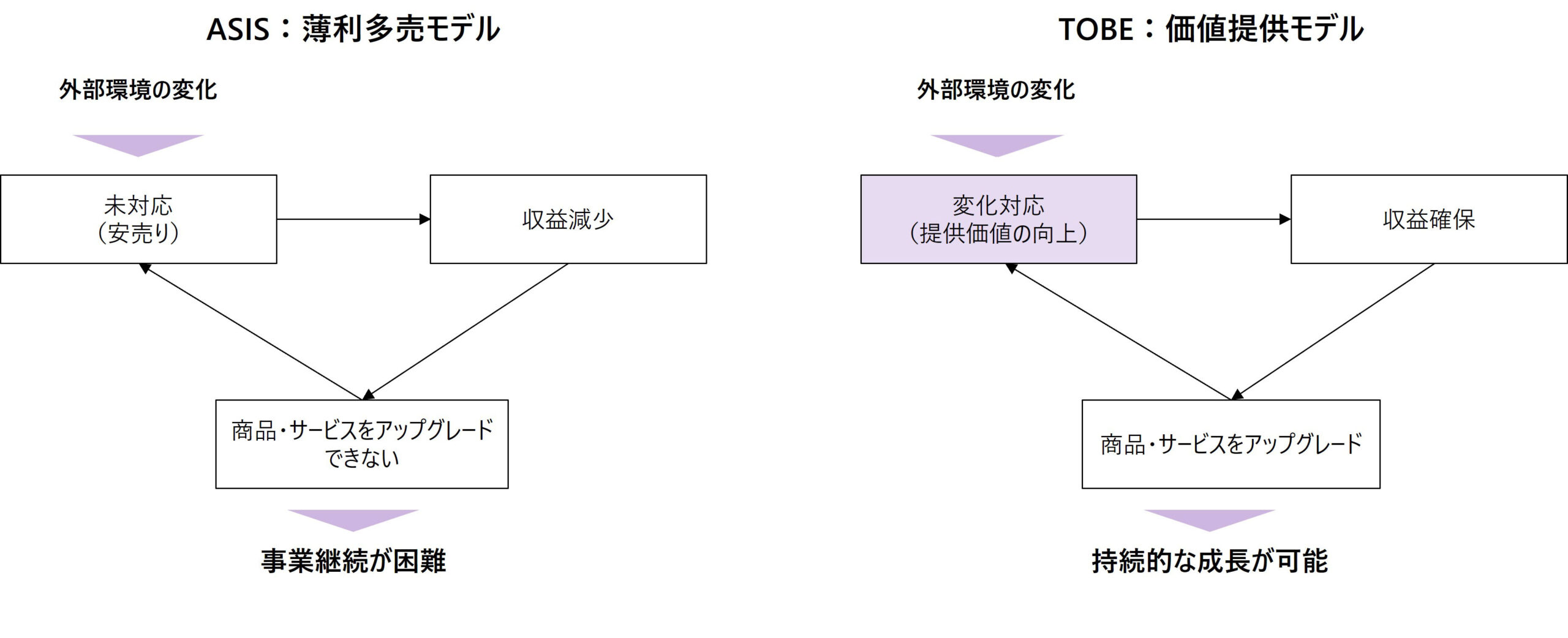 従来、小売業は競合より安値を付けることで来店客を増やし、薄利多売のビジネスモデルで発展してきた。しかし、人口減少に伴い売上が低迷する一方、原材料価格が高騰し、更にエネルギー価格や人件費といった経費も増加しており、従来モデルでは利益を確保することが困難となっている。また、コロナ禍において、人々の生活や価値観は大きく変化し、消費行動に影響を与えている。こうした変化に対応せず、従来通りの安売りだけを繰り返しても結果的に将来の投資が確保できずに事業継続が困難となってしまう。