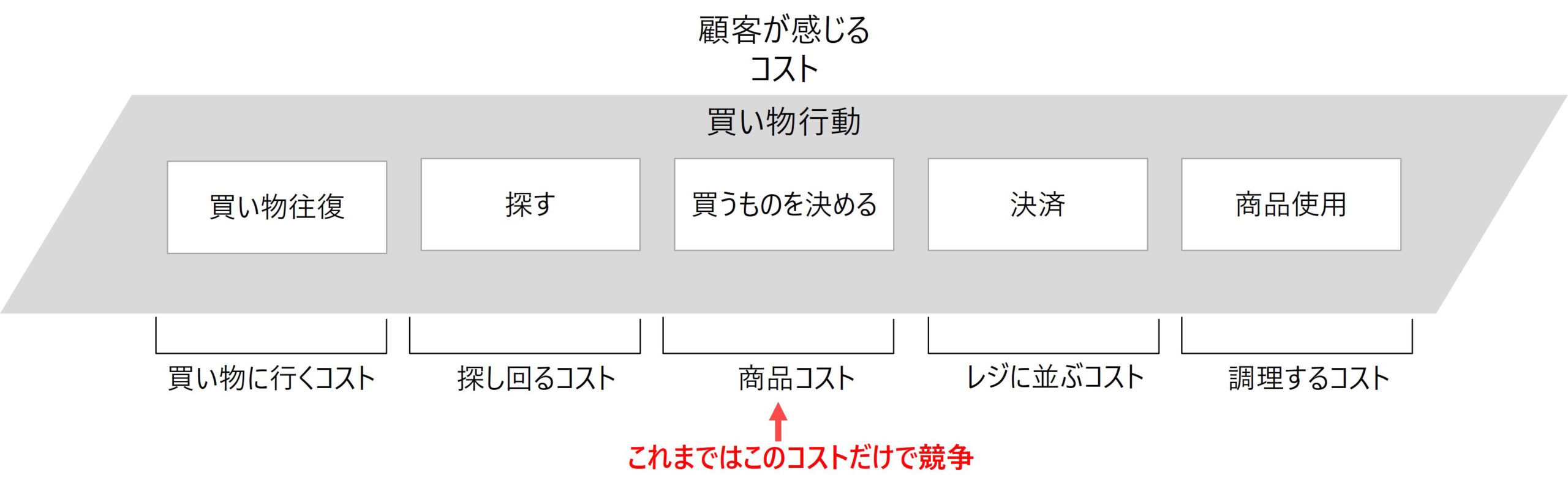 Withコロナと言われる環境で人々は巣籠りを強いられる中、自宅に配達してくれるECへの需要がより高まり、従来ECを利用しなかった層も含め大きく利用が拡大した。例えばコロナ前は買い物をするために出かけるという行為を当たり前と考えていたが、Afterコロナでは、買い物する前に店舗に行くかECにするかという選択肢が当たり前になった。またECの利便性(検索のしやすさ・レコメンドによる選びやすさ)を一度覚えると、店内で欲しい商品があるかどうかを探すという行為自体も煩わしいものと感じられるようになった。こうした変化は顧客にとってこれまで感じることのなかった「コスト」が顕在化されたことを意味する。Afterコロナにおいてデジタルが当たり前になった今、商品やサービス単品の「価格」にのみ注目するのではなく、こうした「顧客が感じるコスト」をトータルで引き下げる必要がある。