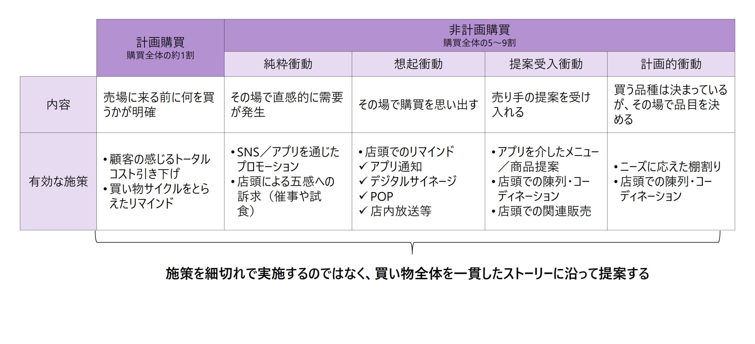 前項で説明した変化やそこから生じるニーズは、商品や店舗などの売り手を起点とした“点”でとらえるのではなく、顧客の買い物に至る“行動全体”でいかに解像度高くとらえられるかが重要となってくる。例えば、買う物があらかじめ決まっている「計画購買」は、顧客自身のニーズが顕在化しており、前項で説明した顧客の感じるトータルコストの引き下げや買い物サイクルをとらえたリマインドが有効になる。小売業にとって計画購買をとらえることは、固定客を獲得することと同義で非常に重要だ。その為には計画購買を便利に出来る環境を提供する必要がある。