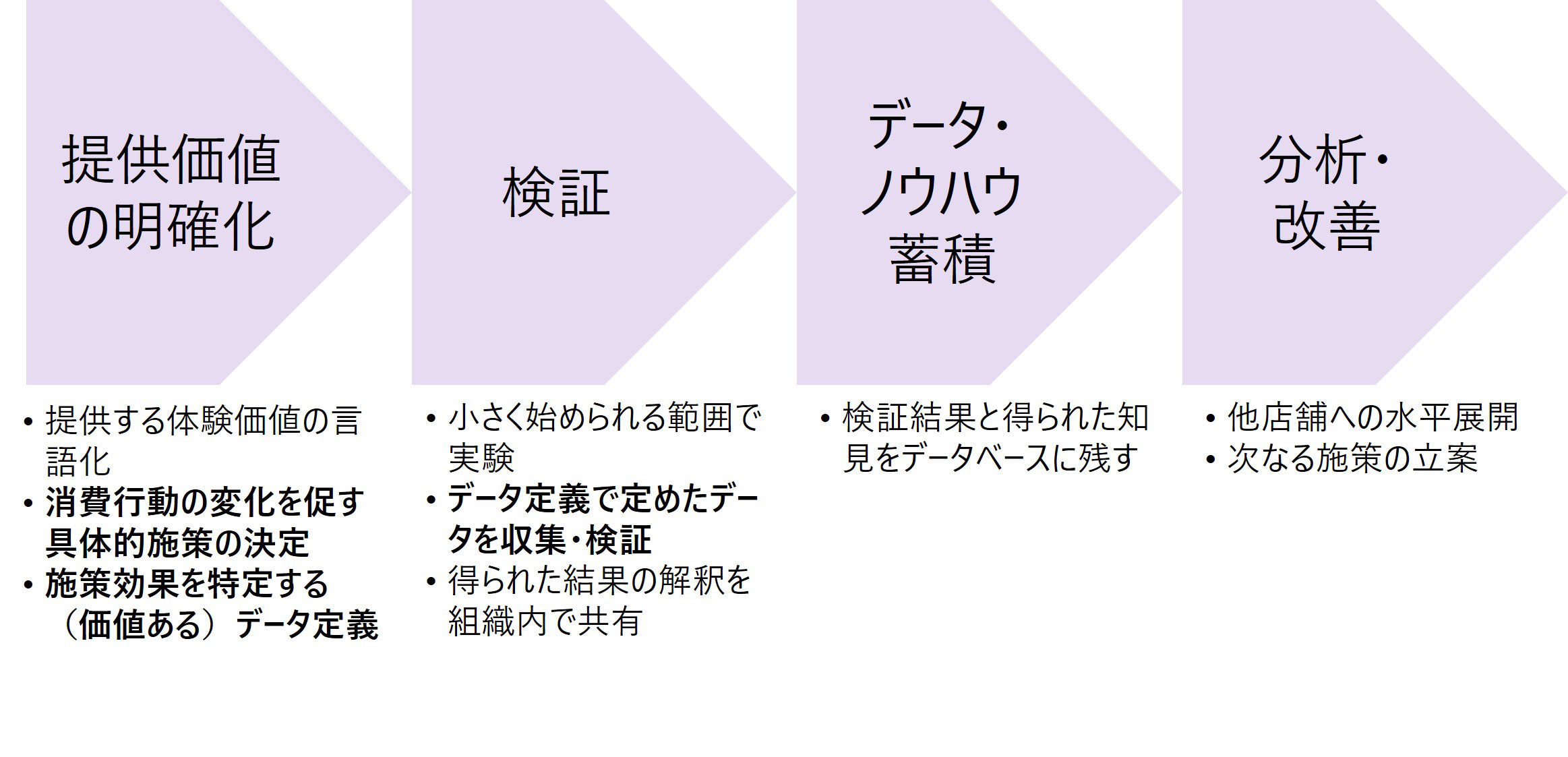 これまで見てきた事例からも、単品の価格だけが自社の提供出来る価値でないことが分かるだろう。顧客が買い物行動全体で感じるコストを下げ、プラス体験を増やすことで自社が提供する価値全体を高める設計が必要になる。ではどのように体験を設計すればよいのか?まずは自社が顧客に対して提供したい価値の言語化・明確化が必要となる。そして、提供価値が実現されたとき、顧客にどのような消費行動の変化が起きるかを整理する。次に小さく始められるところから行動変化を促す施策を実行し、消費行動が現れたデータを特定する。そのデータを蓄積し、何を実施すれば行動の改善につながるかを分析・行動を繰り返すことでノウハウが蓄積し、更なる改善を実施することが可能となる。
