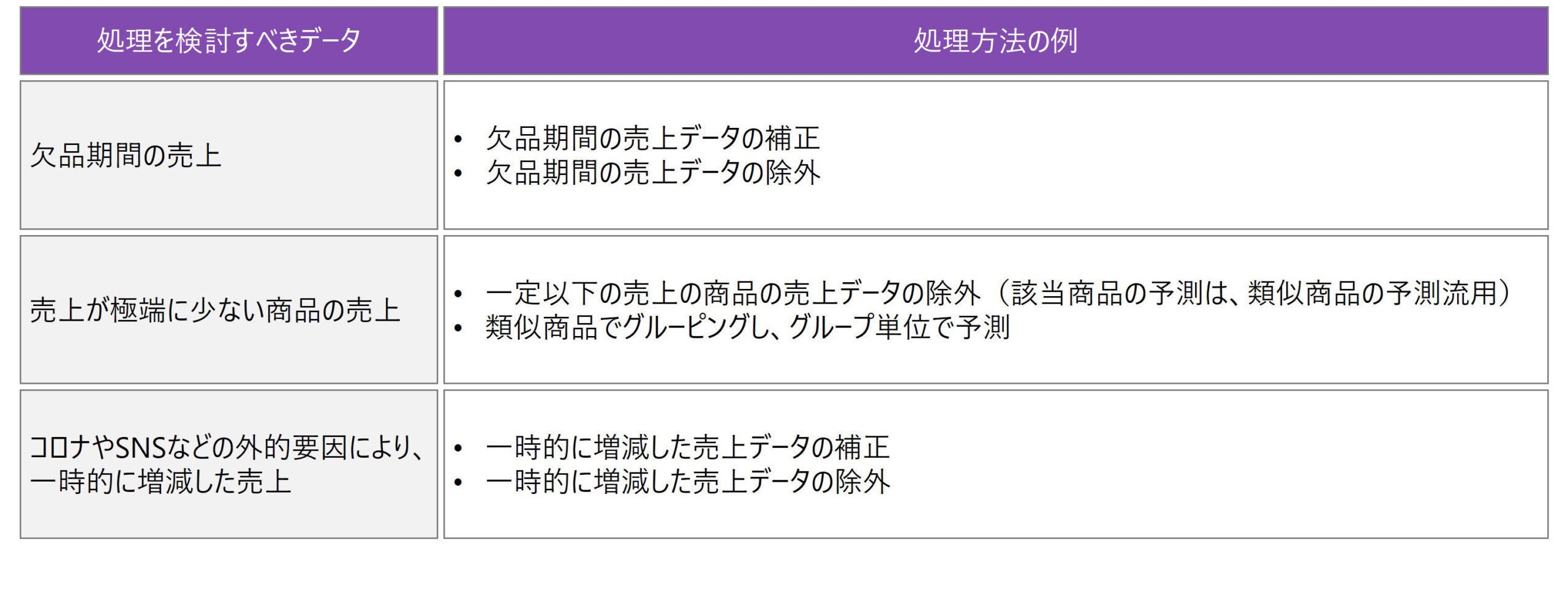 予測ロジックによるモデルでは、予測のベースとなる過去実績をどれだけきれいにできるかが重要である。そのため、過去実績に含まれるイレギュラーなデータをどう処理するかが予測精度を向上させる上でのポイントとなる。