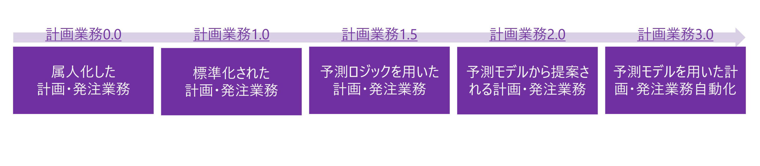 また、クニエでは改革ステップとして、初期の“属人化した計画・発注業務”の状態を「計画業務0.0」とし、ToBeの“予測モデルを用いた計画・発注業務が自動化”された状態「計画業務3.0」までを5段階に分類し、以下のように定義している。小売業に従事している方は、自社が今どのフェーズにいるのかを考えながら読み進めて頂きたい。