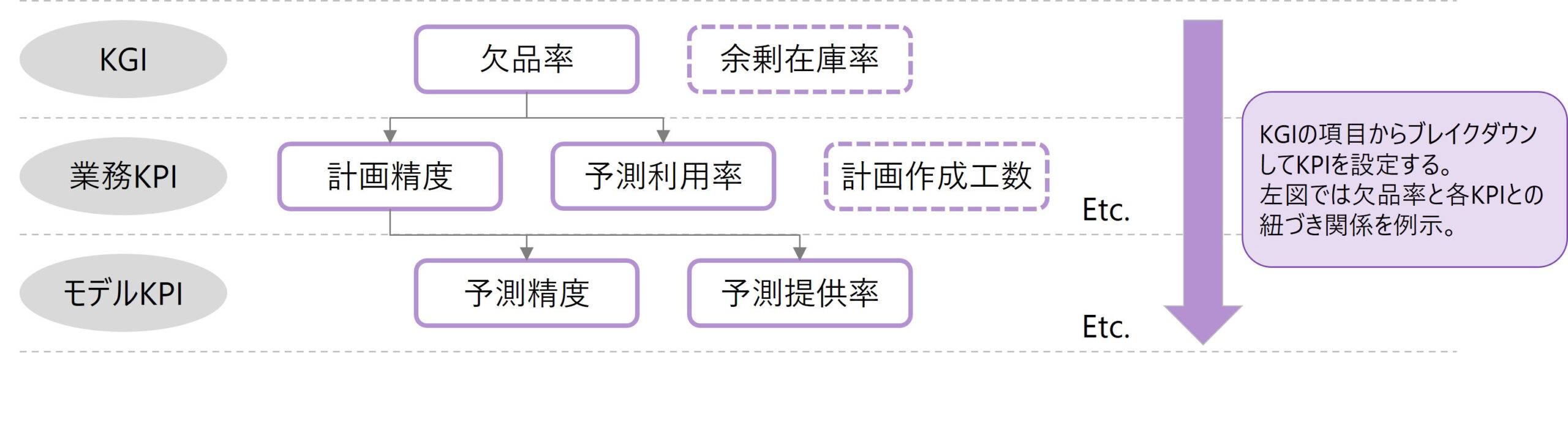 なお、業務KPIはKGI達成のためにモデルのユーザが達成すべき目標であり、計画の精度や予測値の利用率などが該当し、モデルKPIは業務KPI達成のためにモデルが達成しなくてはいけない目標であり、予測精度、予測値提供率が該当する。KGIは「売上」や「コスト」としても良いが、粒度が大きすぎてKPIとの繋がりが見えにくいため、「欠品率」や「余剰在庫率」、あるいは「欠品抑制による売上増」、「余剰在庫抑制によるコスト減」とするとよい。