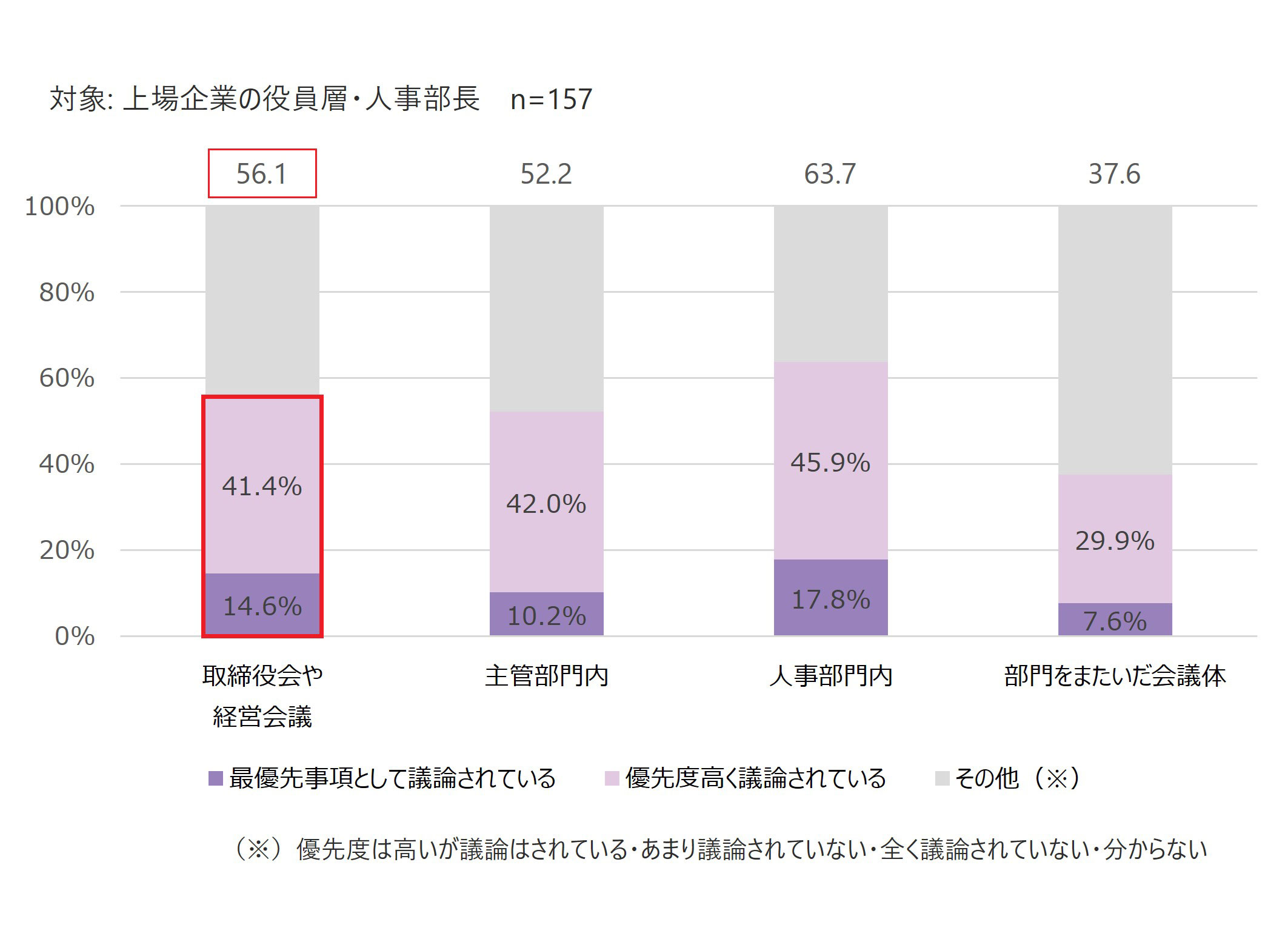 以下のデータは、「人的資本情報やその開示に関して社内でどのように議論されているか」について、パーソル総合研究所が上場企業の役員・人事部長合計157名にヒアリングを行ったものだ。取締役会や経営会議で「最優先事項として議論されている」「優先度高く議論されている」と回答したのは56.1%であり、人的資本情報やその開示が優先度の高いテーマになっていることが分かる。