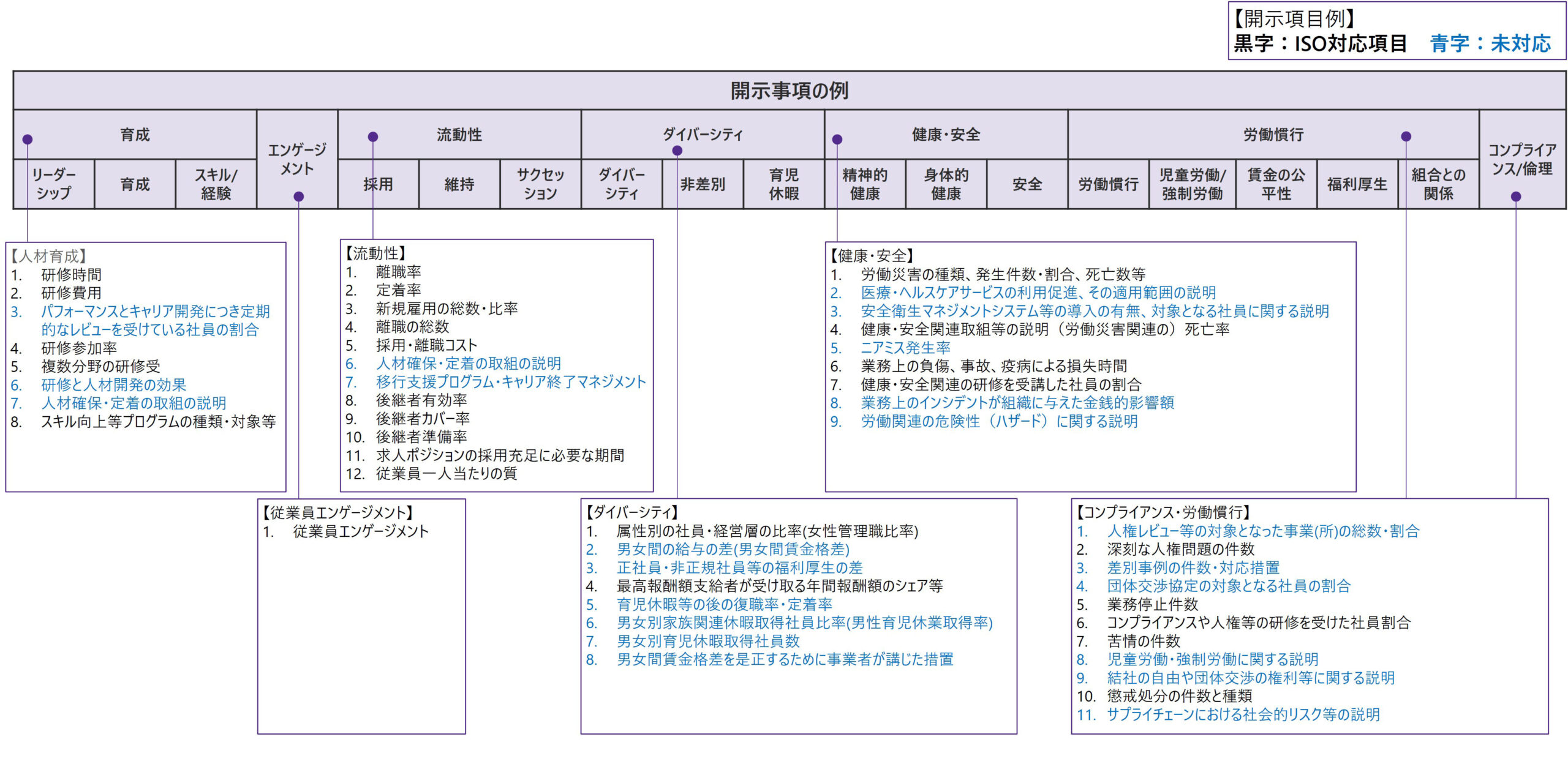 以下は政府指針で取り上げられている開示事項(例)のうち、ISO30414がどこまでカバーしているかを表したものだ。(黒字がISO30414対応項目、青字が未対応の項目)日本の労働慣行や労働法に基づいた事項を除くと、ISO30414が広い範囲をカバーしていることが分かる。